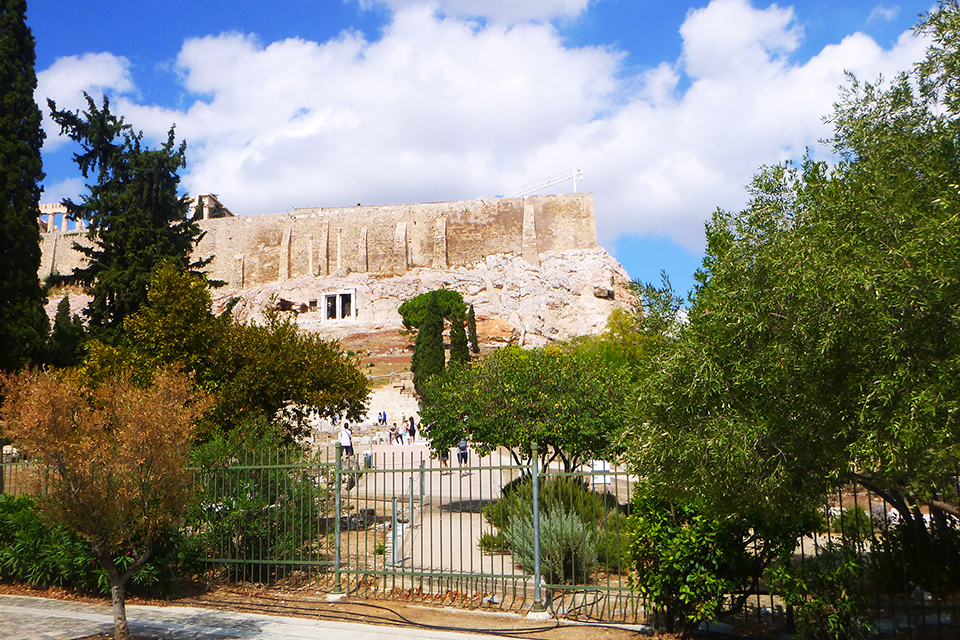 You will see your guide on your right, outside the archaeological site of the Theater of Dionysus.